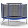12 FT Trampoline features 2.4ft high safety enclosure and heavy gauge galvanized rust resistance steel construction, includes 4 W-shaped legs for enough stability and support.Safety enclosure netting are perfectly attached to the steel tubes which connects the enclosure net with the spring cover. No extra gaps between the mat and net to ensure your safety when jumping.8 foam padded poles support UV-proof safety trampoline enclosures for maximum safety while jumping. The polyethylene woven net has a dual zipper and latch clip for safety.The frame consists of galvanized rust resistant steel, which is durable and rust resistant, also provides longer service life for the trampoline, hold up to 330lbs.72 5" long steel rust resistant springs located around the outside of the enclosure net for safety. Heavy duty 3-step galvanized steel ladder offers convenient maneuverability when you in and out of the trampoline.Specification: