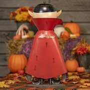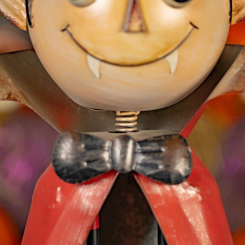 Our Big Head Halloween Figurines have been a hit this trade show season. Standing slightly over two feet tall, this iron crafted Vampire is perfect for tabletops, shelves, and window displays. His ginormous head doubles as a small dish with the top functioning as a lid. His tall skinny legs go all the way up to his neck, and is freestanding on a round flat base. Surround him with his big head friends ZR191044 - "Jack" the Pumpkin Man and ZR191045 - "Frank" the Monster for a fun, kooky-spooky decorative display! - Indoor/Outdoor safe - Powder coated iron - Weather & rust resistant - Hand painted - Freestanding - Removable lid (top of head) - Candy dish storage - Packaged 4pcs/master; 1pc/inner Master Carton: 31.68lbs 28.3" x 19" x 31.5" H. Inner Carton: 5.6lbs 27.5" x 9.25" x 15.15" H. Specifications Material: 100% iron Item Weight: 4.6lbs CBM: 0.279 (4pc/carton) Candy Dish Depth: 7" Candy Dish Diameter: 5.5" Base Dimensions: 13" x 8"